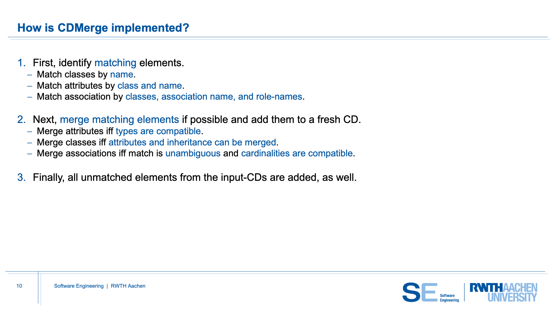 A central strength of CDMerge lies in its semantically sound merging. Conflicting or incompatible model elements are not silently overridden or auto-repaired; instead, CDMerge explicitly detects such inconsistencies, ensuring that the formal semantics of the input diagrams are preserved.