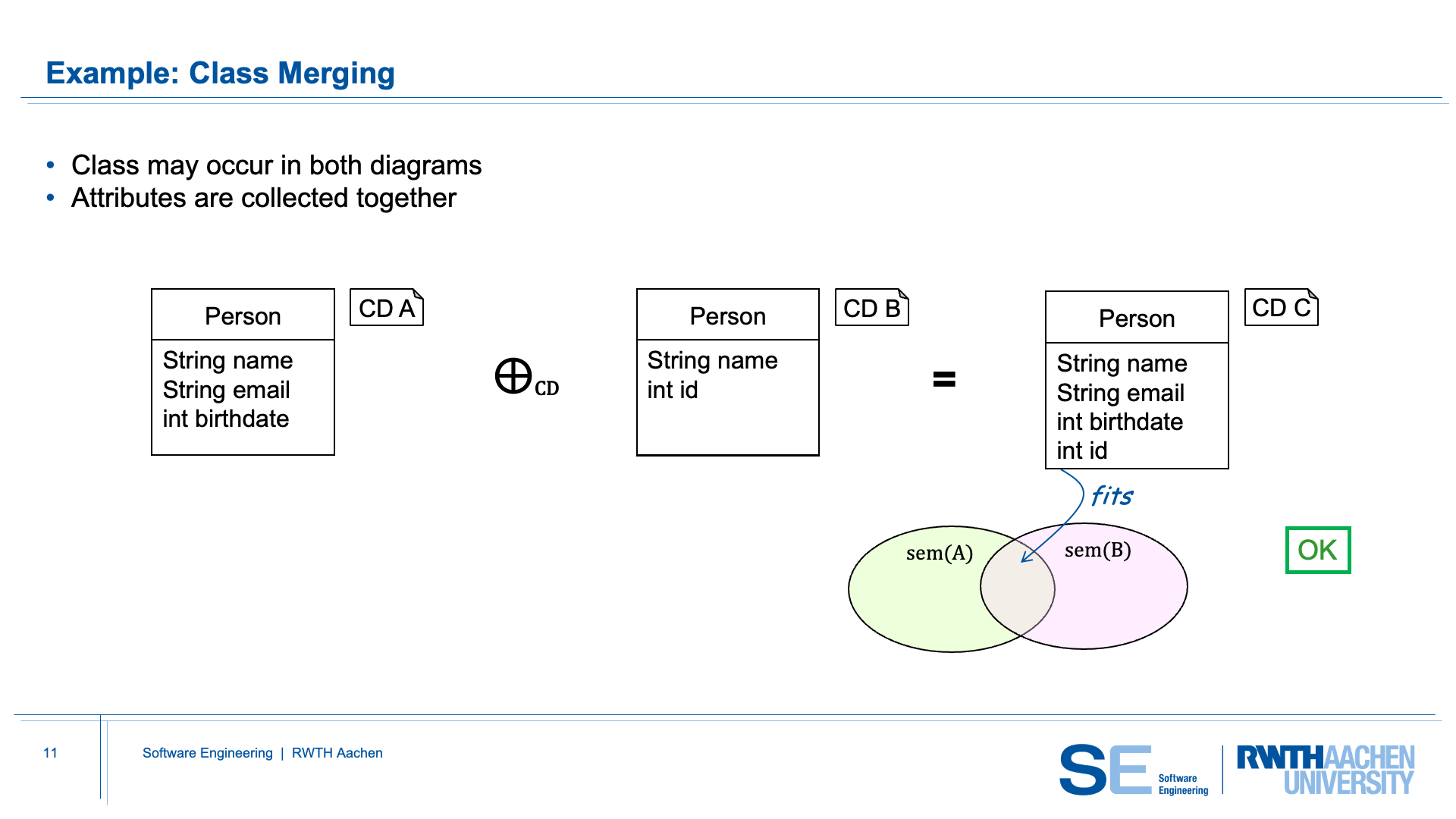 ⊕combines the two class diagrams into a new, integrated diagram. - From the merged diagram, new generated code (