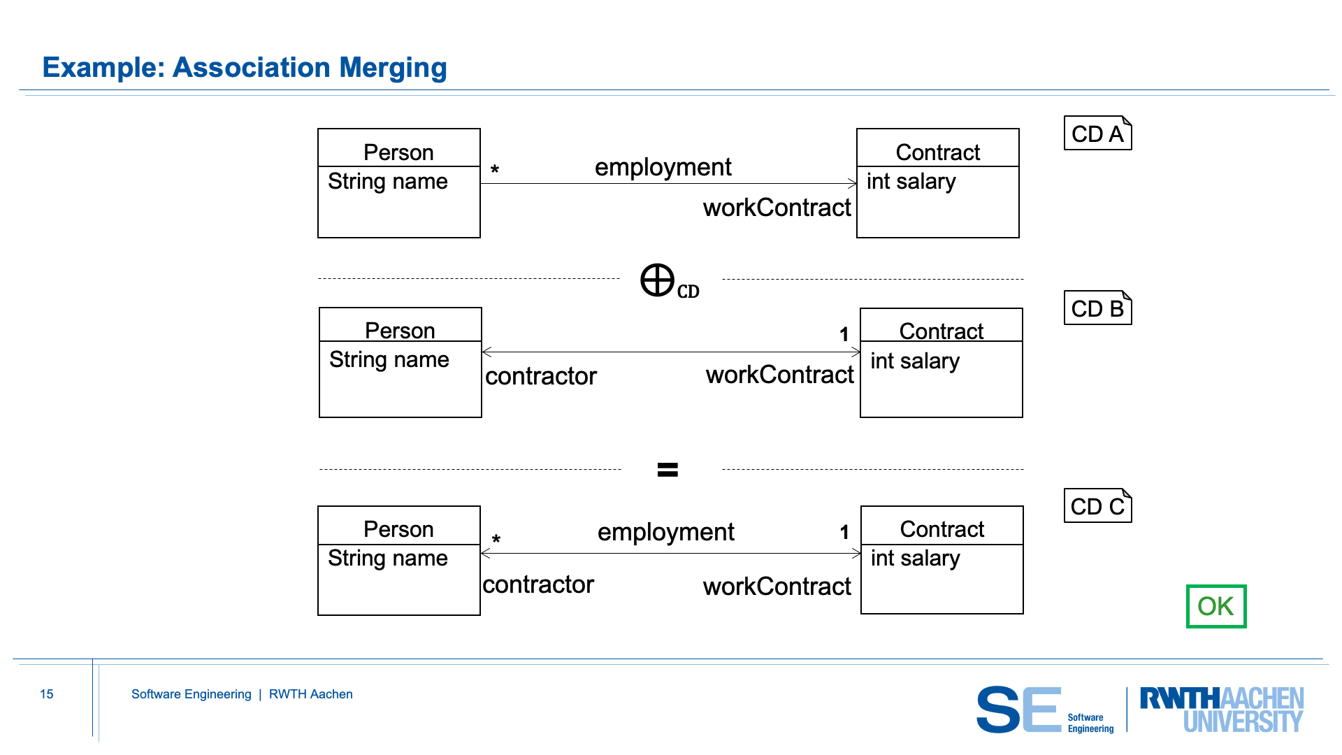 same pair of classes with compatible roles, and the merged association in CD C