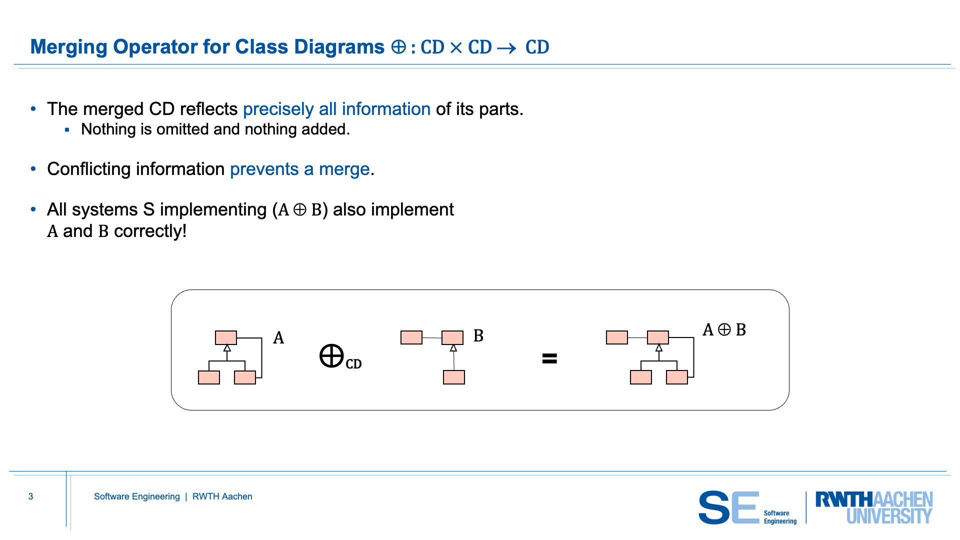 The merging operator ⊕ combines two class diagrams into a single diagram whose result contains all information provided by both inputs. Nothing is removed and nothing new is added; the merged diagram is therefore the exact combination of both diagrams. A merge is only possible when the information in the two diagrams is compatible. If contradictions occur—such as conflicting attribute types, incompatible inheritance relations, or inconsistent cardinalities—the merge cannot be performed. Any system that satisfies the merged diagram (A ⊕ B) automatically satisfies both diagrams A and B, reflecting the intention of the merge operator: the merged model captures exactly what both diagrams jointly require.