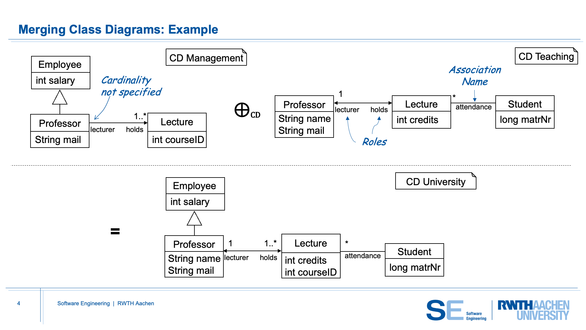 When both diagrams are merged, all compatible information is combined into the single class diagram University. The merged diagram contains: