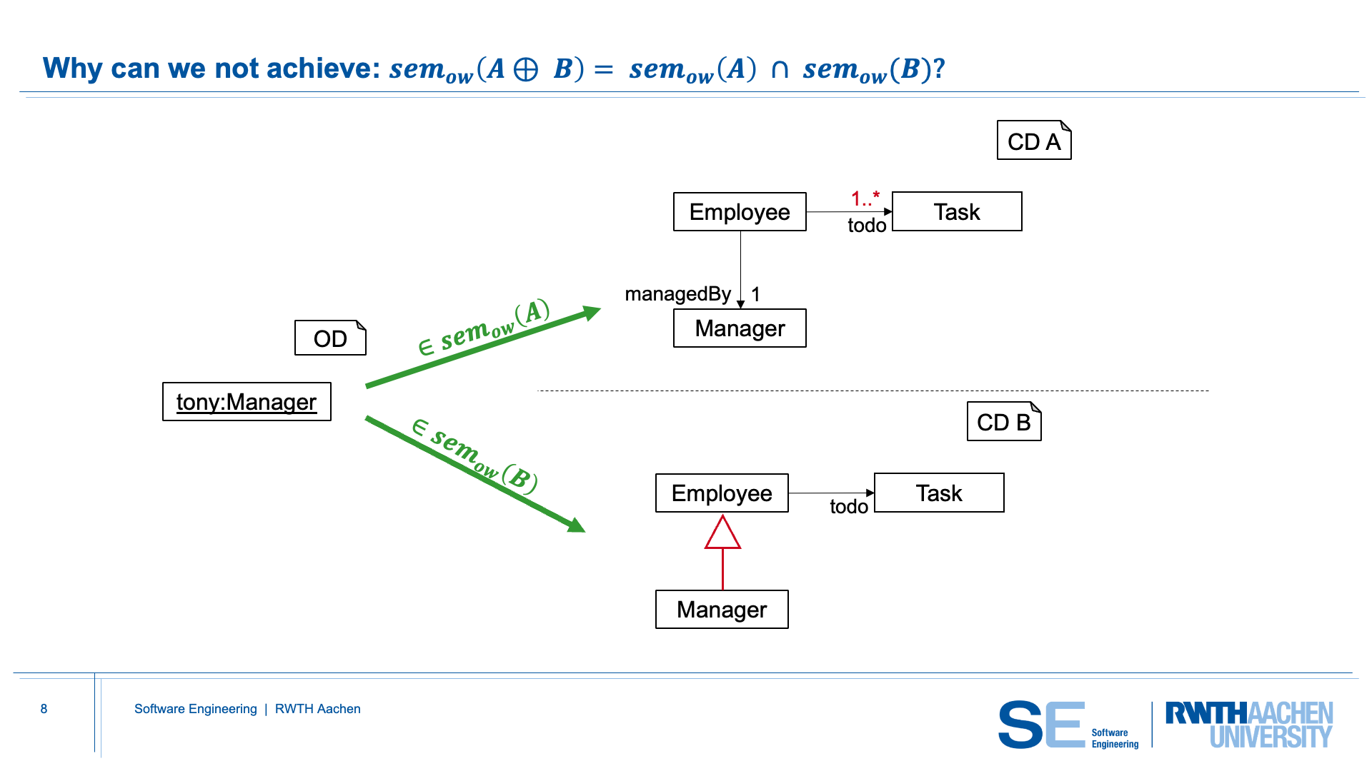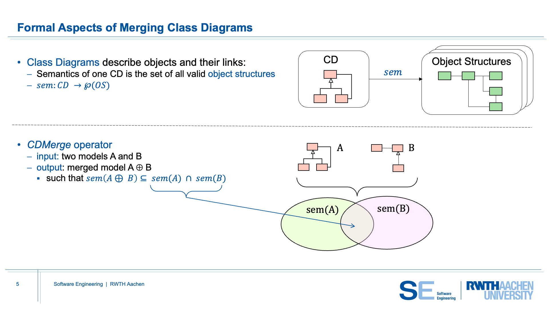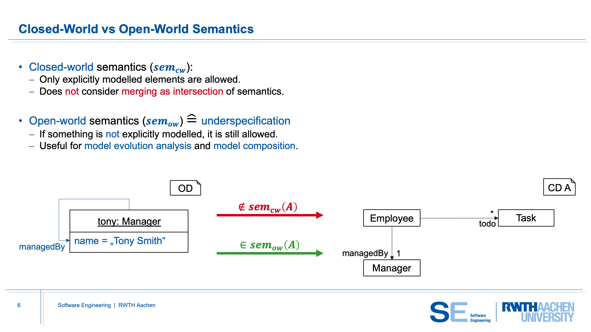 Two different interpretations of class diagram semantics can be distinguished: closed-world and open-world. Under closed-world semantics, only the elements that are explicitly modeled in the class diagram are permitted. Consequently, merging cannot be interpreted as an intersection of semantics under this view. Open-world semantics, in contrast, treats missing information as underspecification. If something is not explicitly modeled, it is still allowed as long as it does not contradict what is specified. This interpretation is particularly useful for model evolution and for composing independently developed diagrams.
